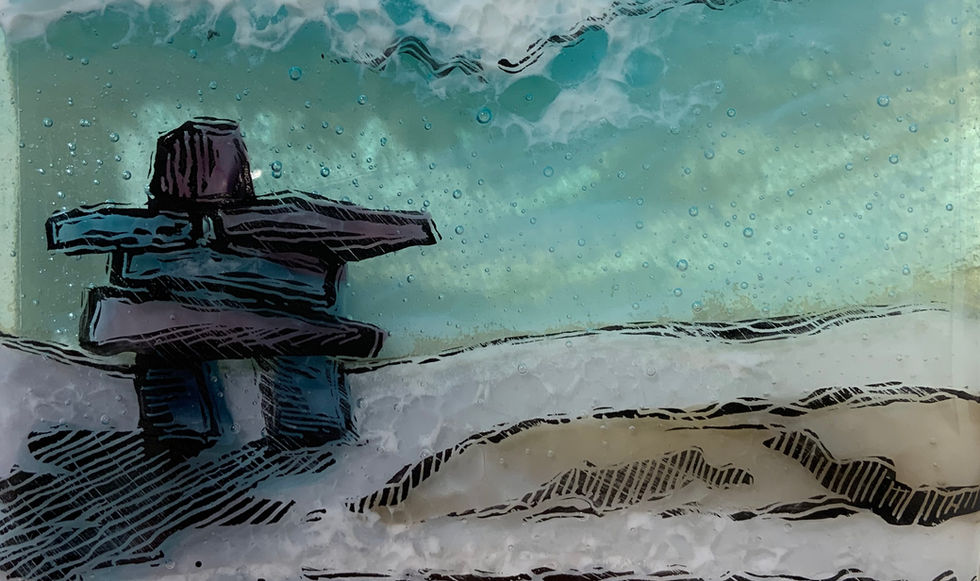 concassé et de plusieurs rangs de verre. La fusion de ces éléments prend 20 heures au four. Je peux répéter le processus jusqu’à l’obtention de la profondeur désirée et ajouter de la peinture à l’émail pour faire ressortir des détails.